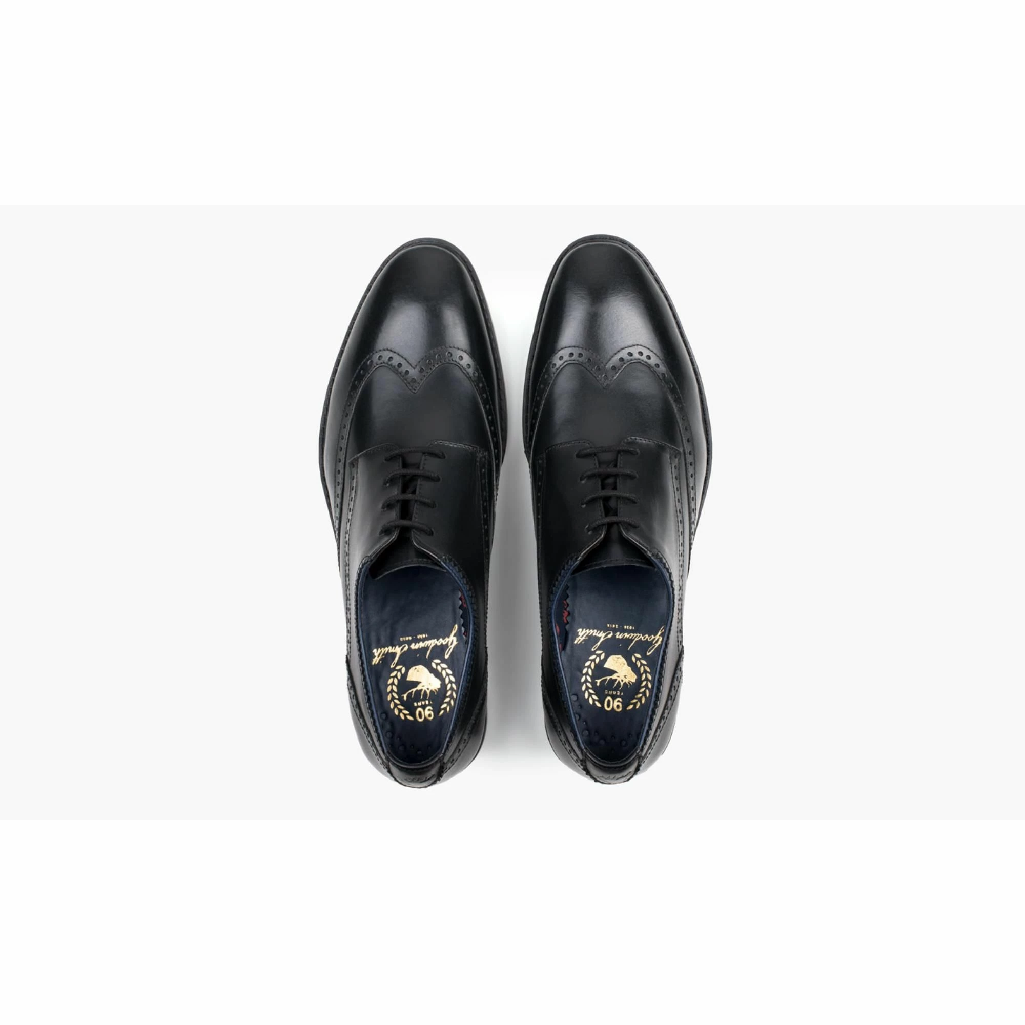 Aubyn is our elegant derby shoe, perfect for any dress up occasion. Featuring an expertly hand burnished leather upper with winged toe cap, brogue detail to the stitch channels, and our trademark navy topline detail and heel tab. The PU and textile lining is printed with GS stag logos and the padded sock also has the logo embossed in gold. Finished off with a durable, anti-slip TPR sole branded with our trademark details. Available in black, brown and tan.”