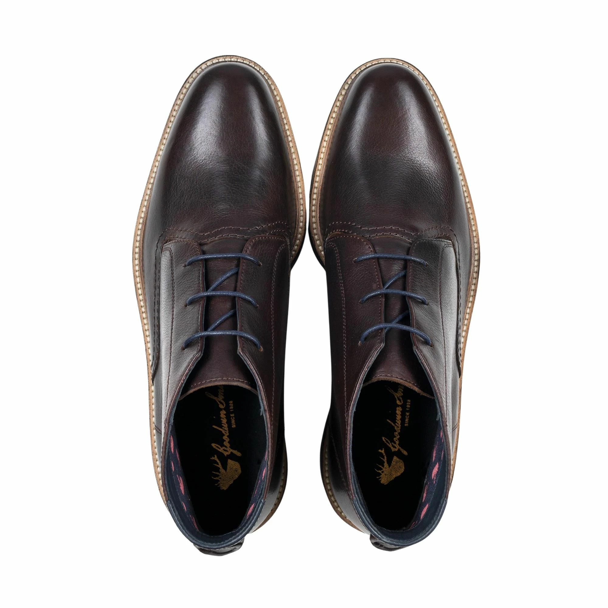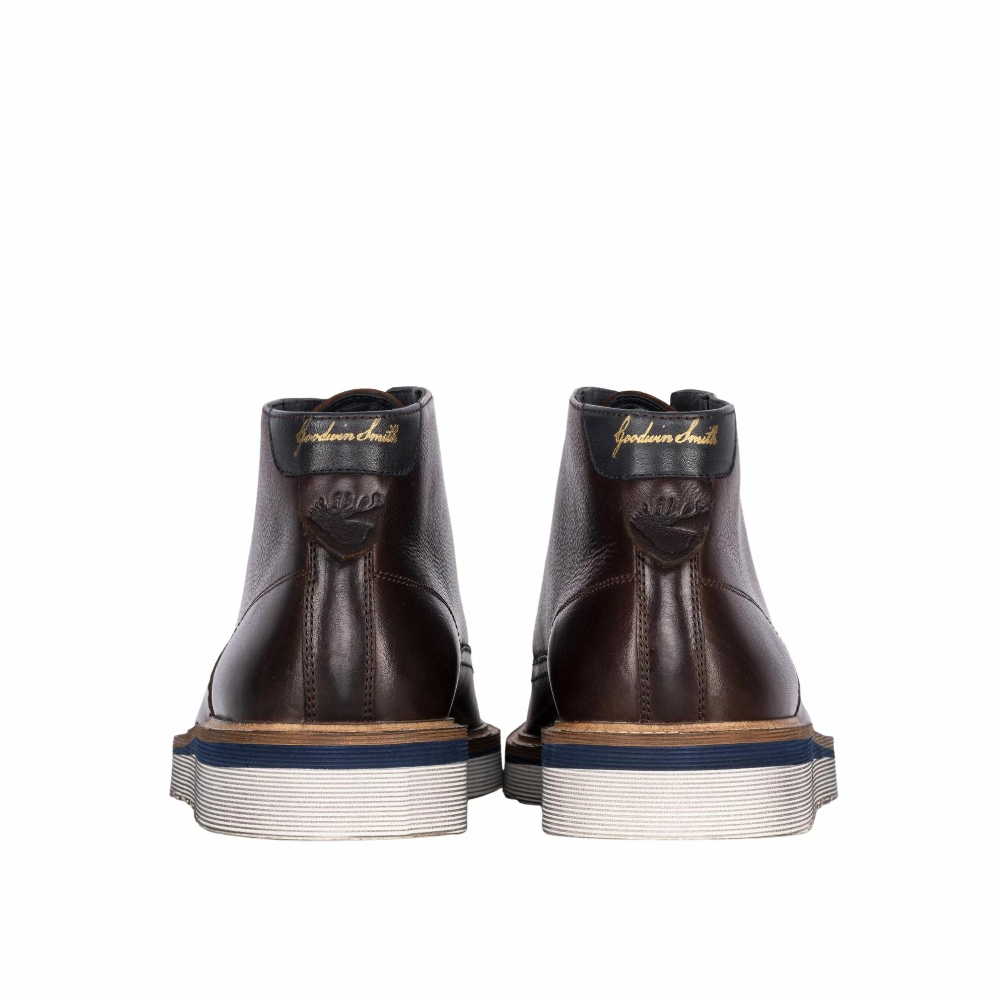 The classic Chukka boot design on a white wedge to give a 21st century upgrade. Originally, worn by British Soldiers during the Western Desert Campaign in the Second World War. Different from a Desert Boot, which has a crepe sole. The GS Weston features a high quality, heavily milled, patchy burnished upper in a three eyelet derby formation, and retains the traditional styling of the classic boot. Stag emboss. The textile lining is printed with GS stag logos, and the padded sock also has the logo embossed in gold. Bottomed off with a durable anti-slip ‘lined’ EVA sole unit and GS blue flash. Sublime.