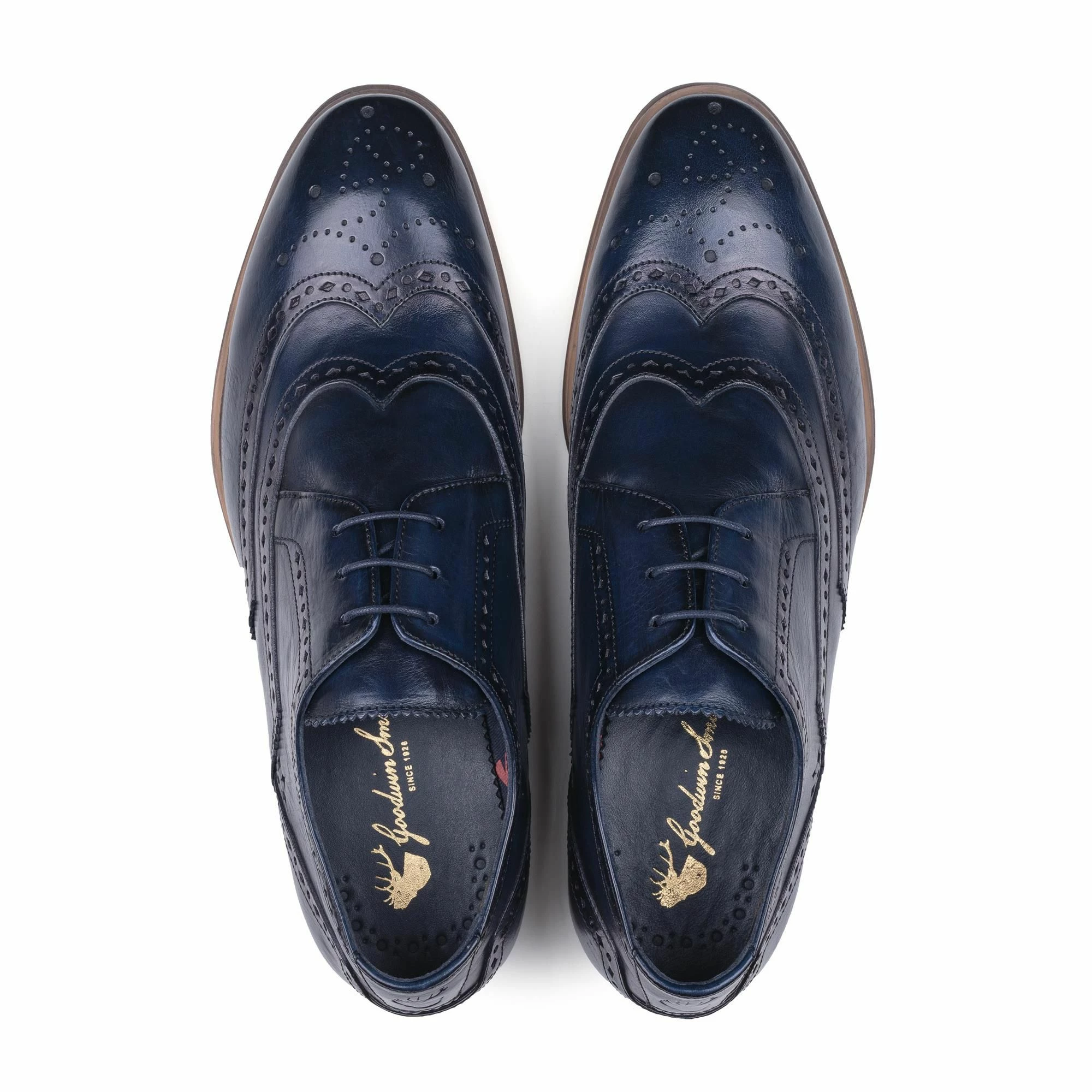 Introducing Daniel our fashionable summer brogue shoe. Featuring a derby brogue pattern with winged toe cap and brogue detail, heavily hand burnished feature scrunchy leather, this leather is a rustic leather which has been specially treated to create a random creased effect ensuring every pair is unique from the next. Our famous stag logo is debossed to the heel area. Leather and textile lining printed with GS stag logos and padded leather sock with GS logo embossed in gold. Durable leather look unit sole, debossed with our logo and tread detail, further complimented by stitching detail. Available in rich tan and navy.