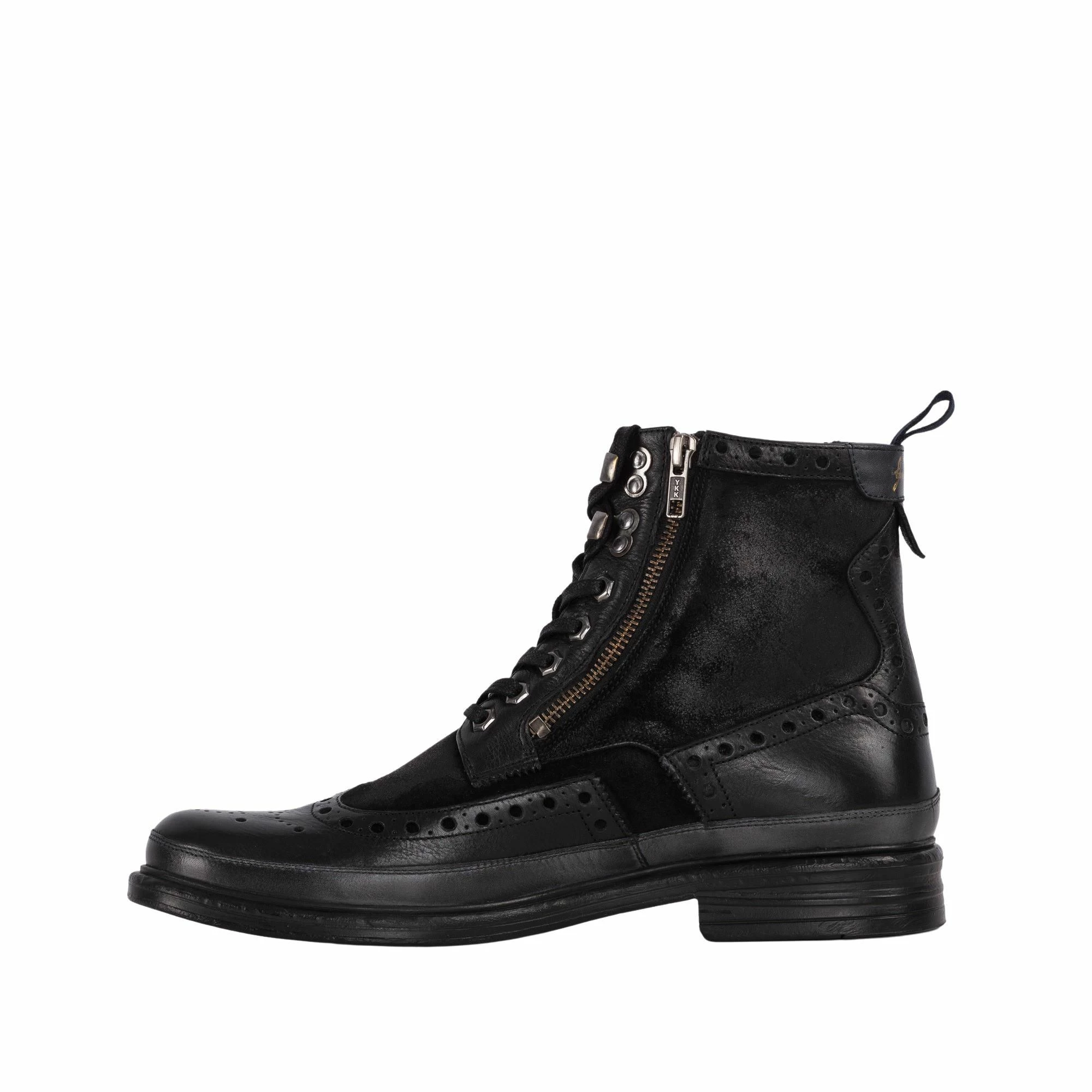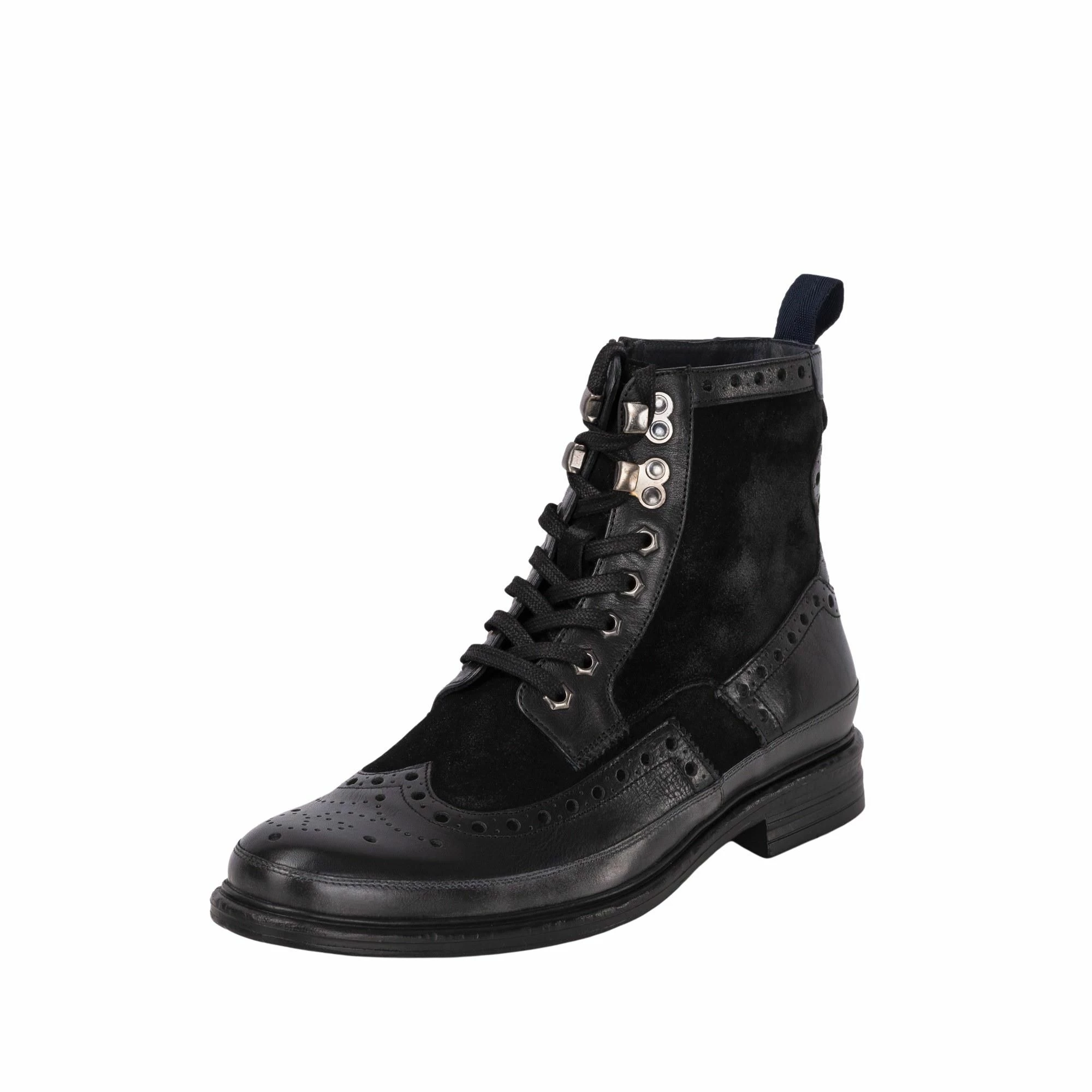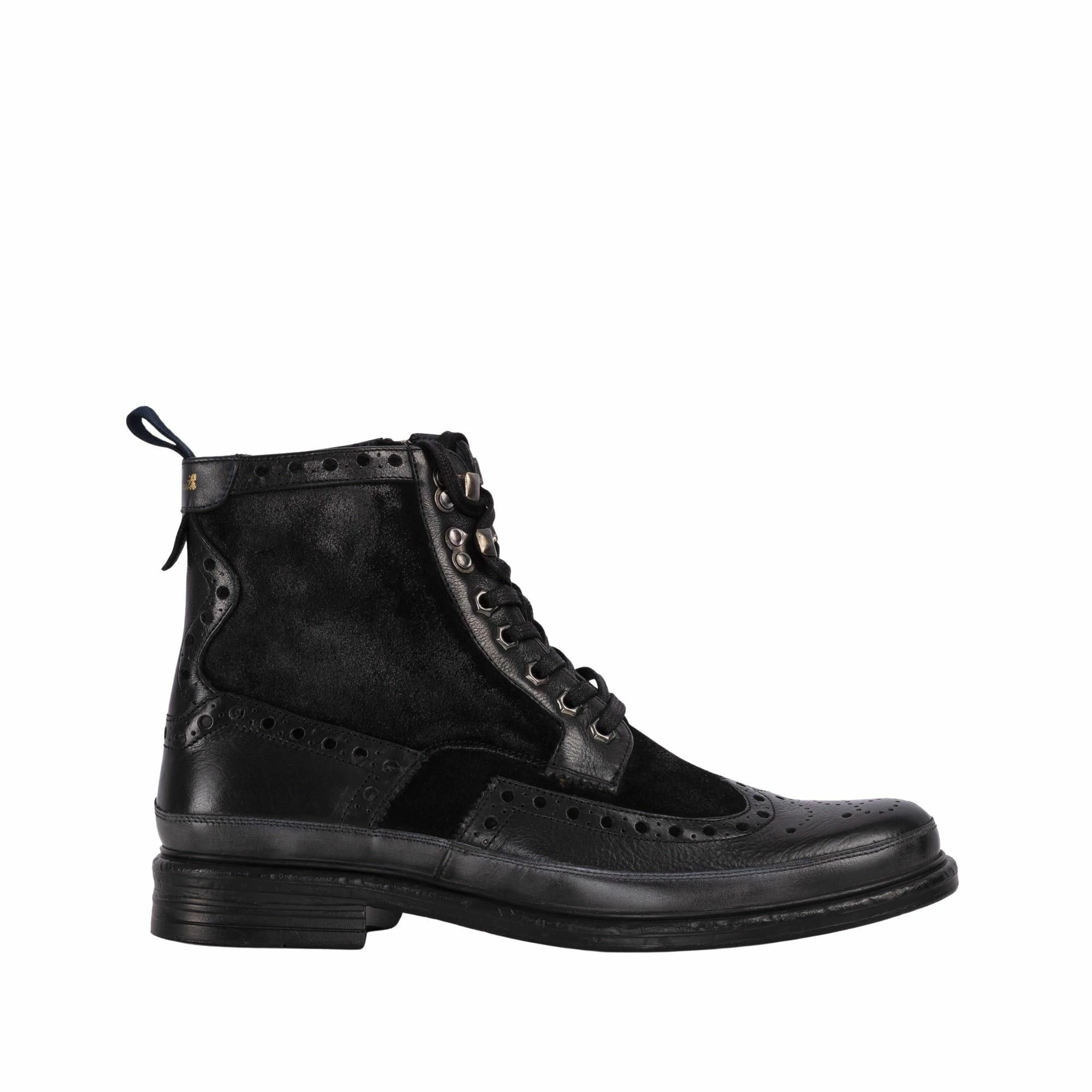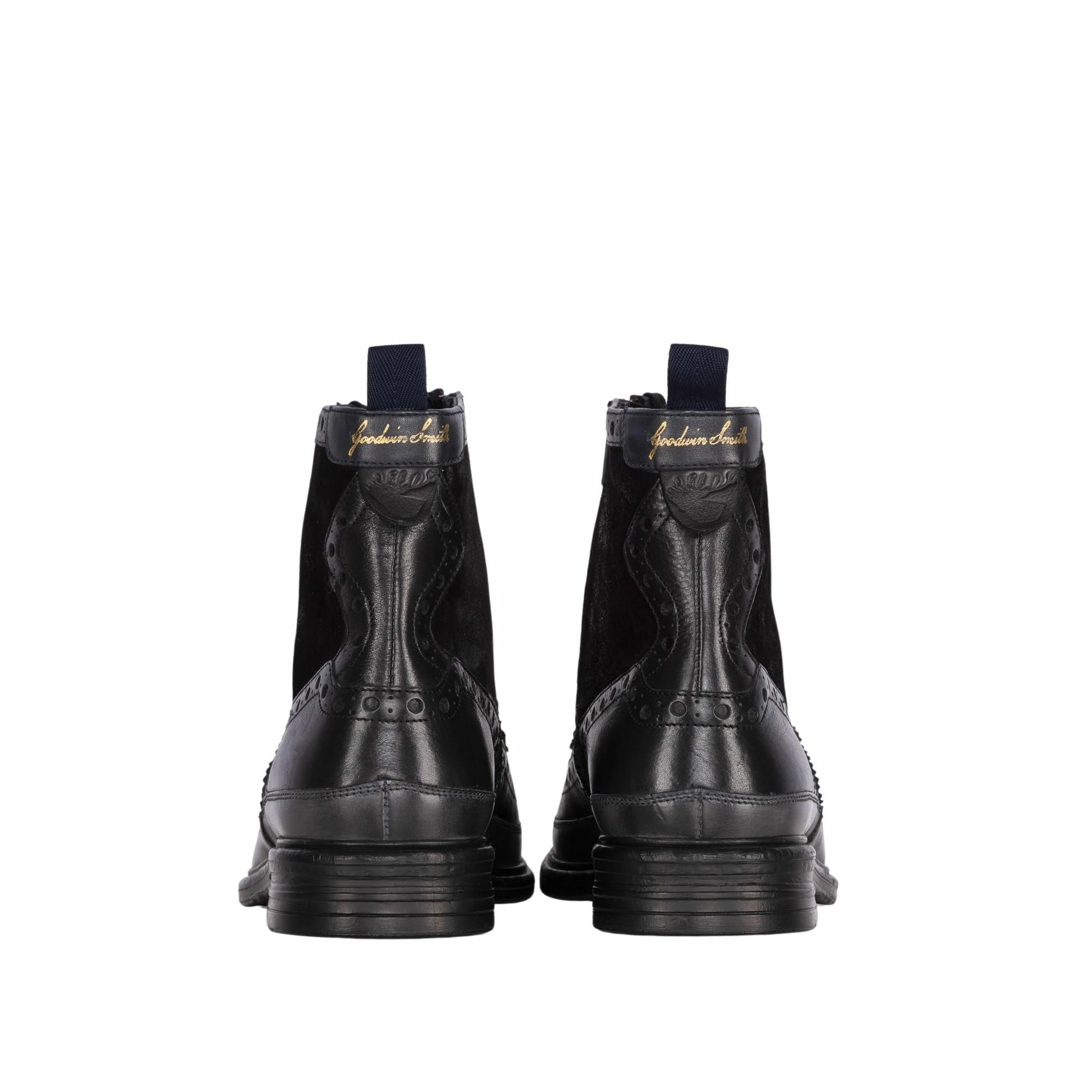 Introducing Davis Artisan brogue boot. Very dapper. This model offers a stunning blend of leather and canvas to produce a very stylish result. Waxed and milled canvas vamp. Hand-burnished leather extended heel panel. Stag logo debossed to heel area. Leather and textile lining printed with GS stag logos and padded leather sock with GS logo embossed in gold. Heavy duty cleated TPR (thermoplastic rubber) sole unit with leather welt. Also available in brown and tan combination.