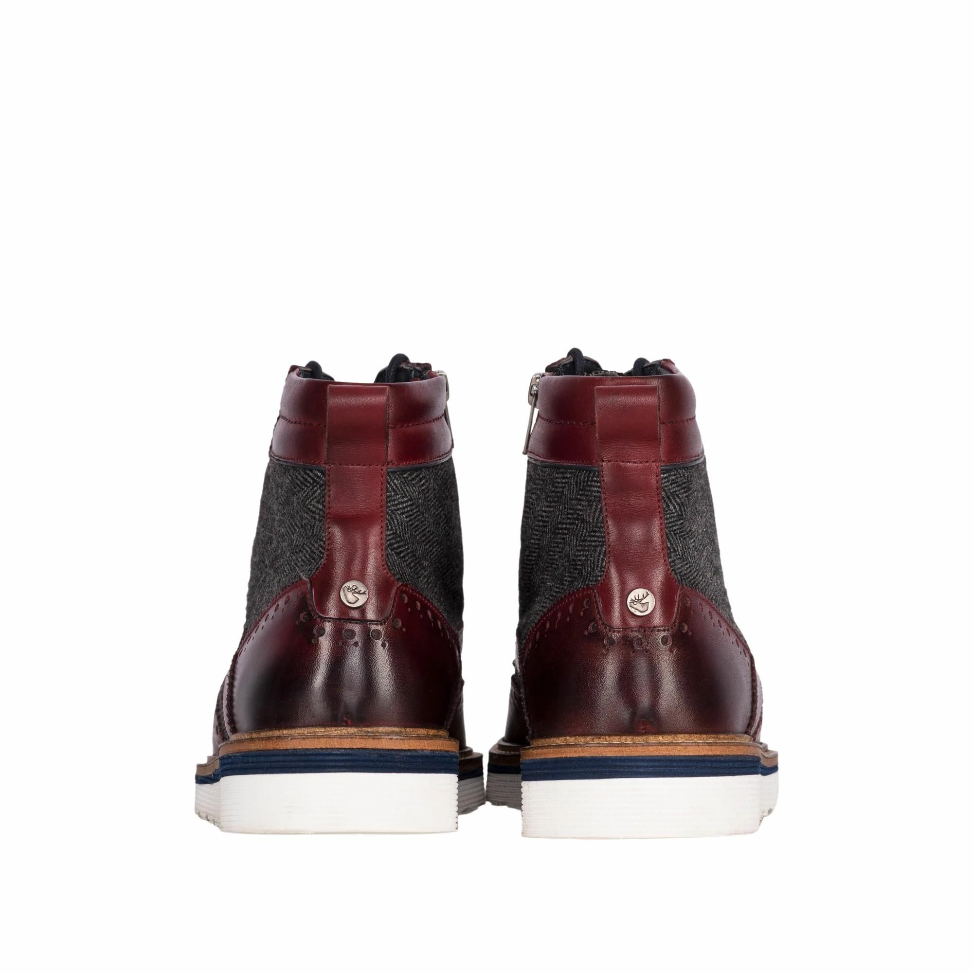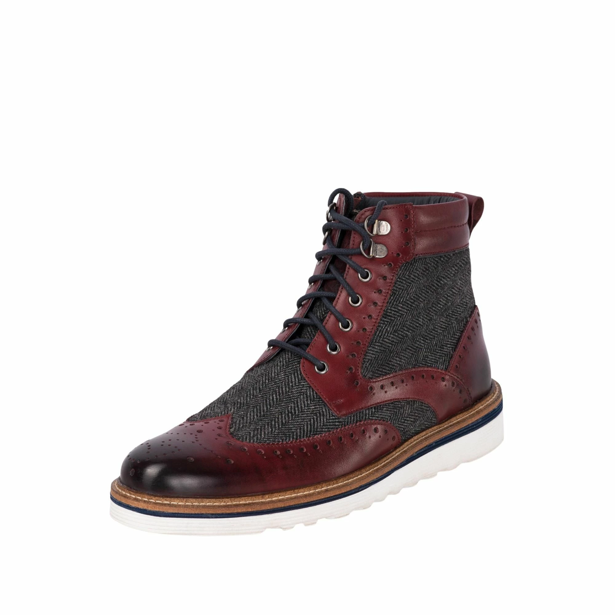 Linwood Bordo casual, waxed leather-twill combination brogued boot on contemporary white anti-slip tyre-track EVA sole. Padded collar, serrated tongue edging, hiking eyelet detail. Brogue detailing to the forepart, brass GS Stag Stud. Leather and textile lining printed with GS stag logos and padded leather sock with GS logo embossed in gold. A masterpiece of footwear engineering! Limited edition. Also available in Tan. Get it while you can.