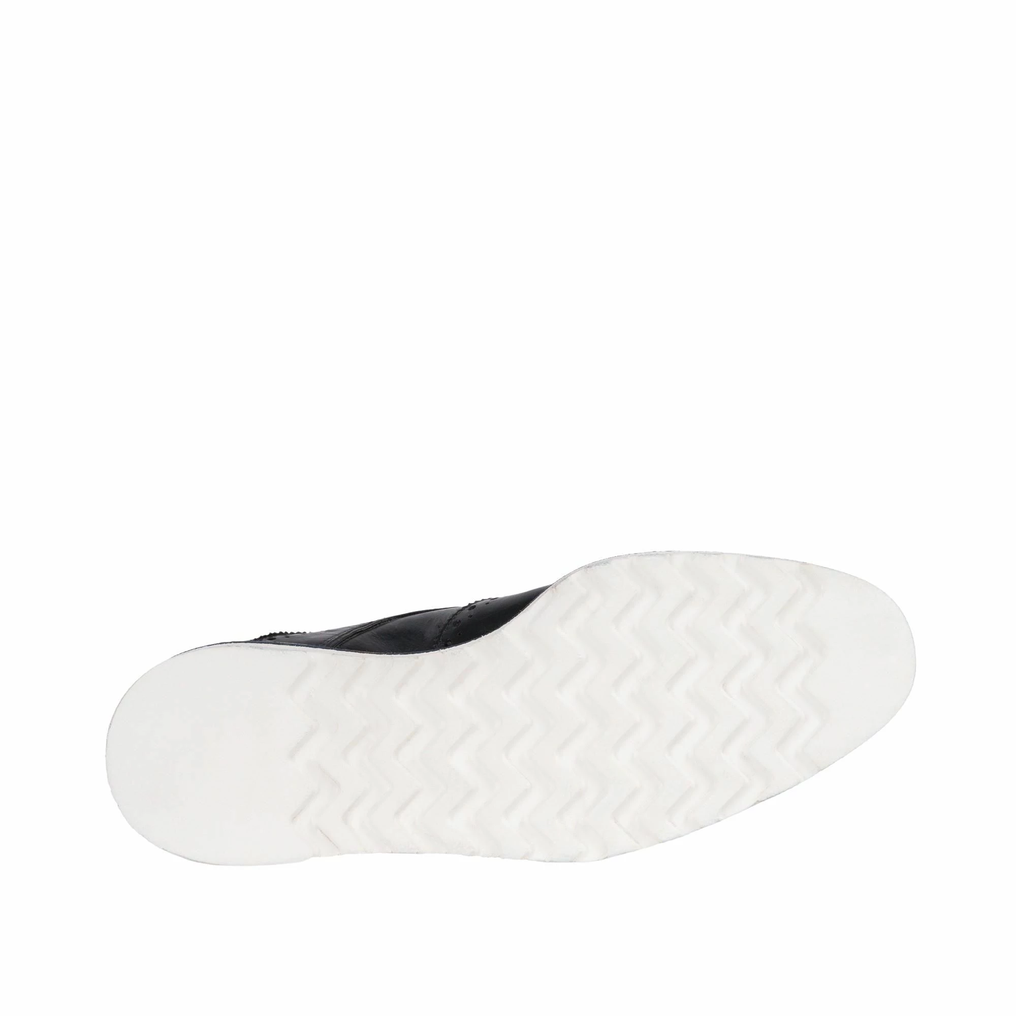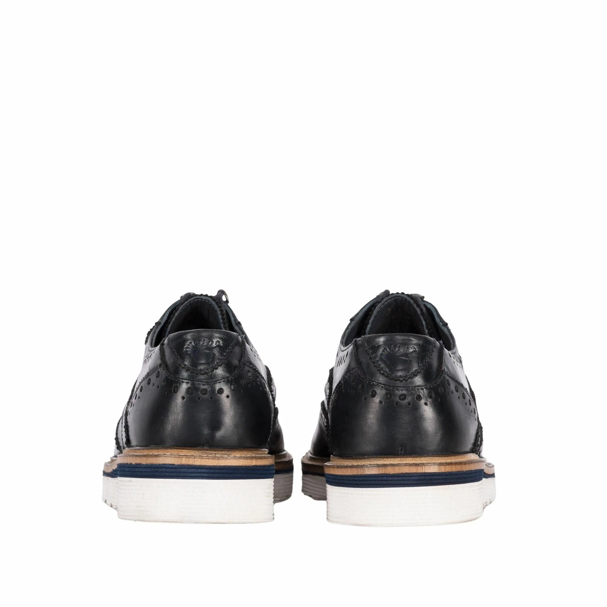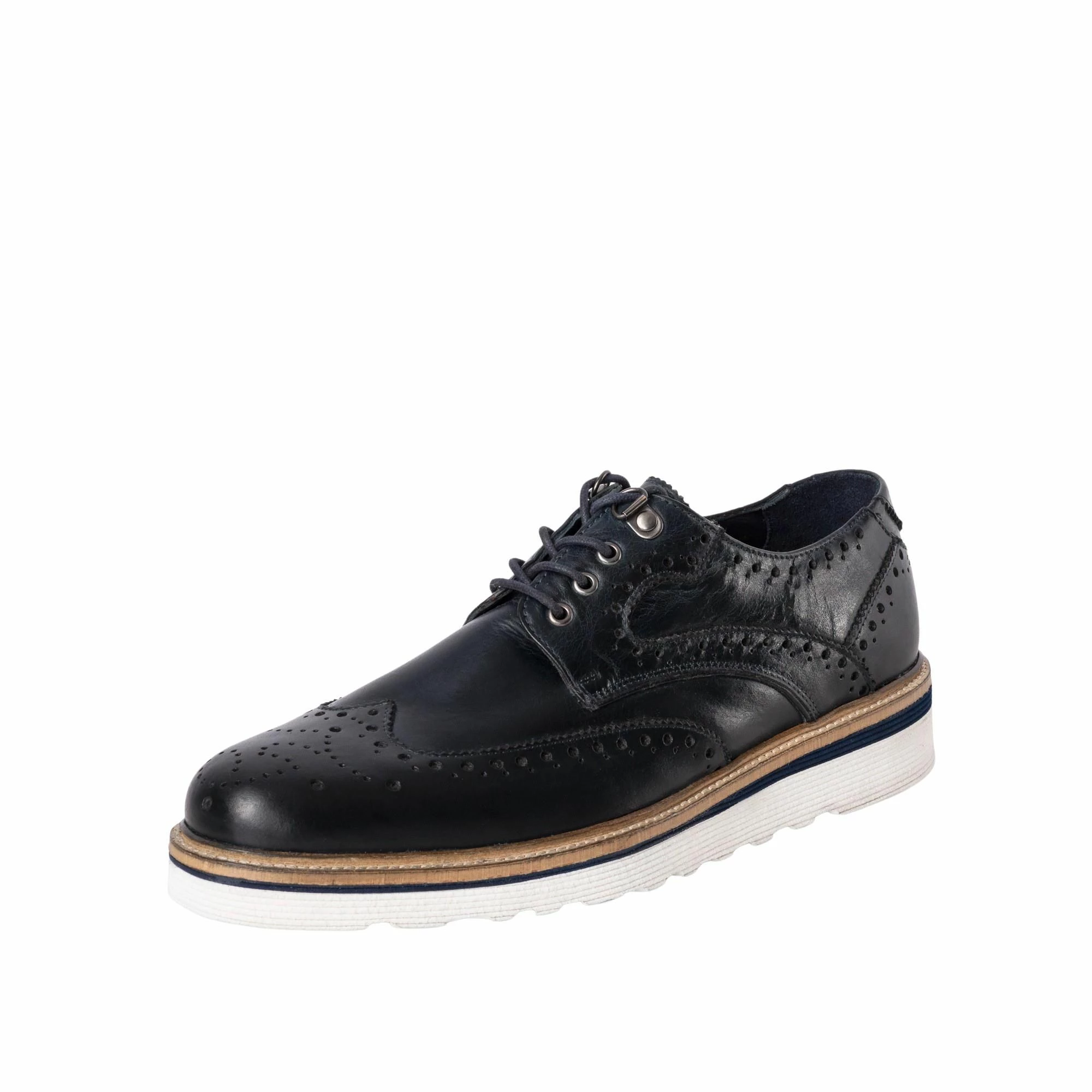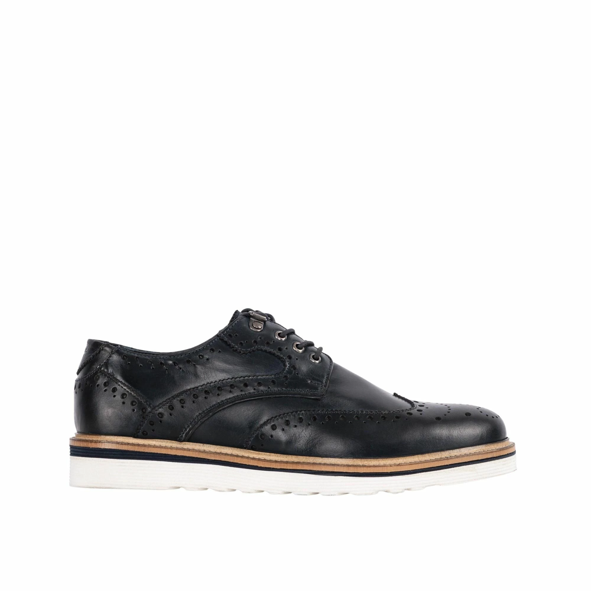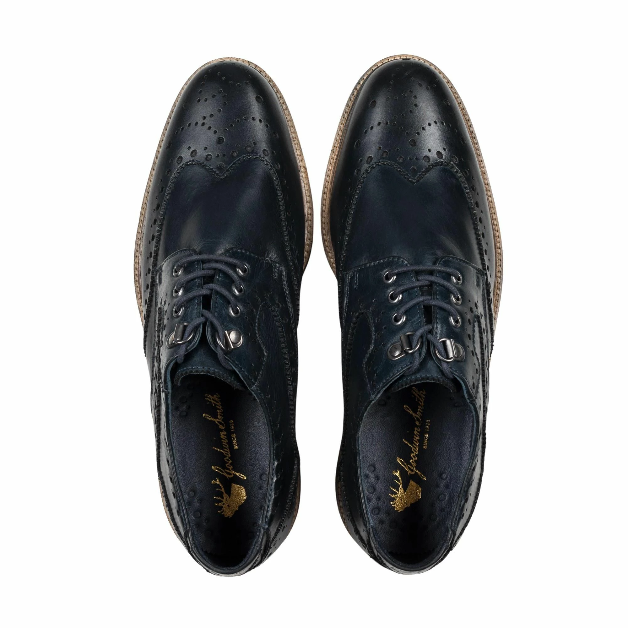 Ripley Navy Wedge Derby shoe. A stunner. Richly burnished wax leather upper. Broguing detail throughout. Serrated tongue edging with hiking eyelet lace grips. GS Stag logo debossed to heel tab. Leather and textile lining printed with GS stag logos and padded leather sock with GS logo embossed in gold. Durable EVA wedge unit with anti-slip tread detail topped with leather welt and GS blue flash. Also available in Tan and Brown.