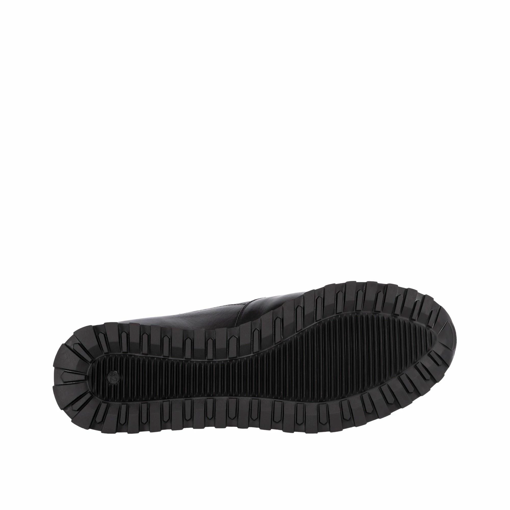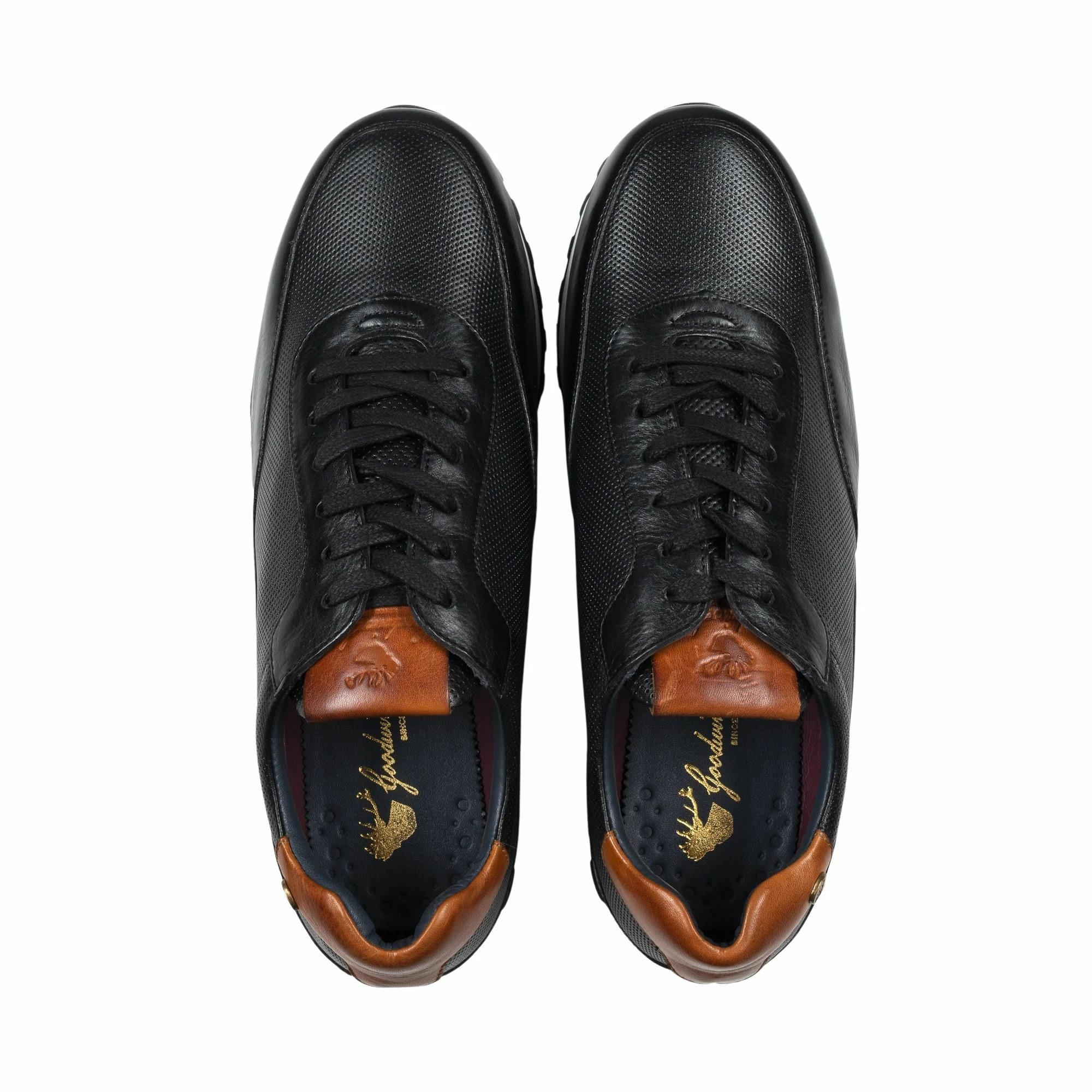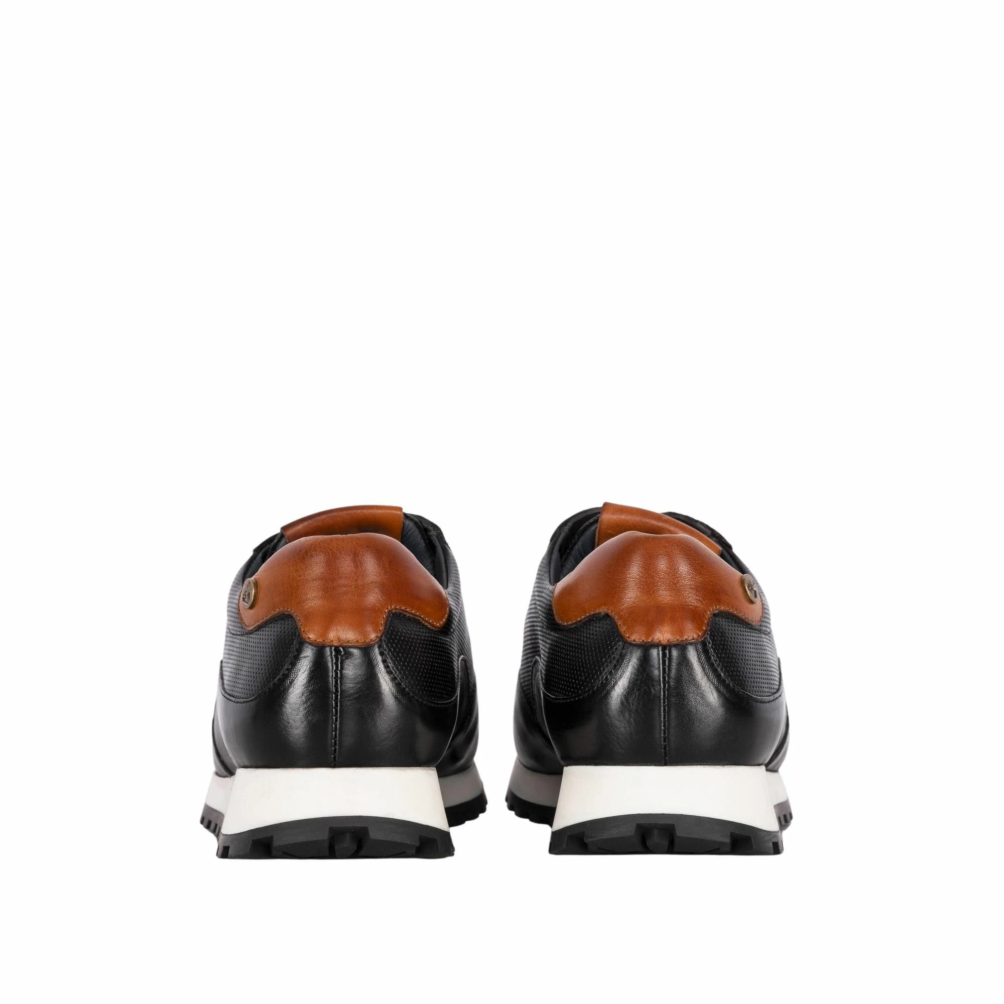 Rogan is a new stylish trainer. Wedge trainer pattern with richly waxed 100% premium black leather upper complimented by navy leather heel trim. Stag logo in gun metal stud to heel. Leather padded collar with debossed GS logo. Lining and stag printed canvas lining with comfortable sports top sock. TPR sole with anti-slip tread. Also available in Tan.