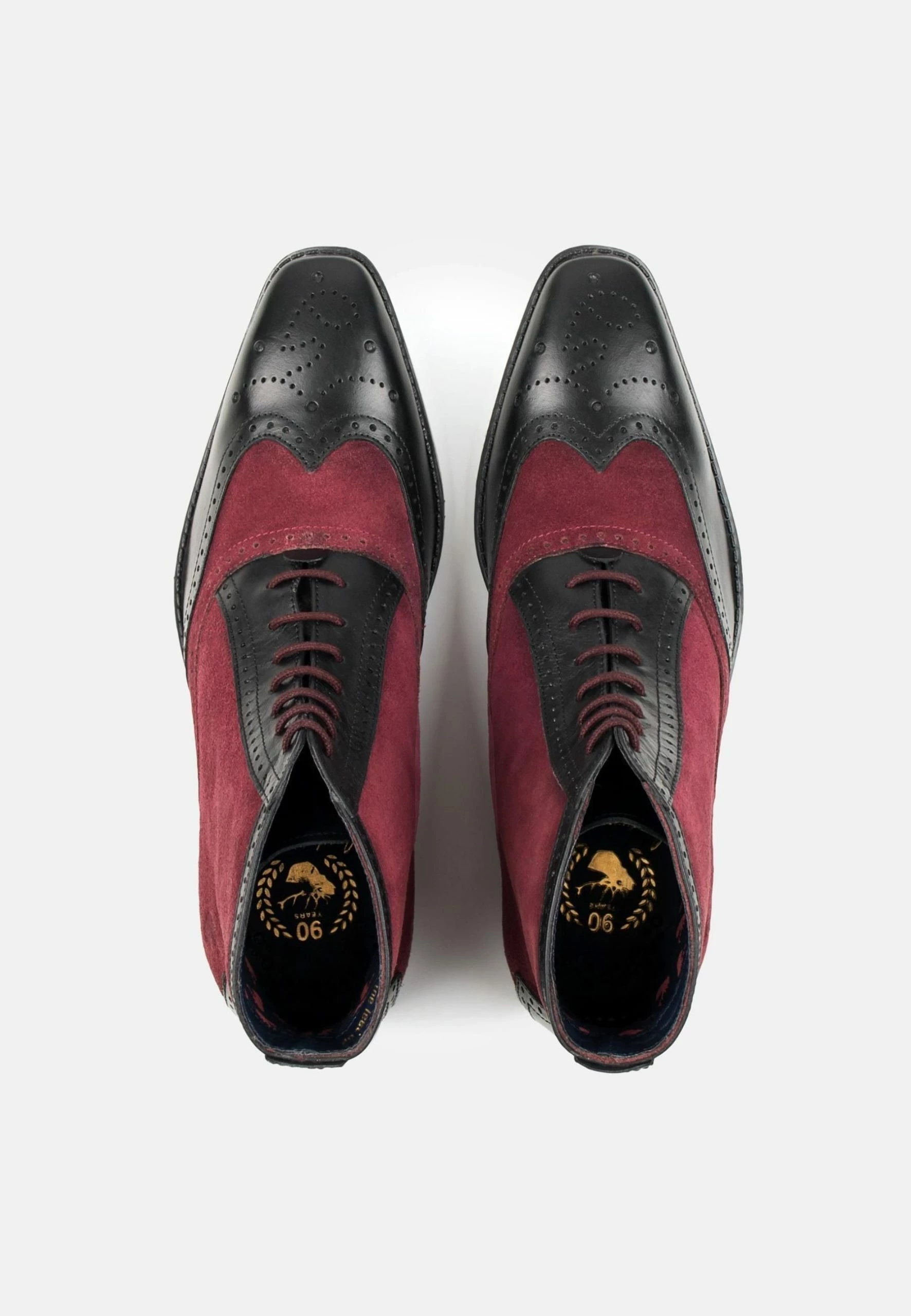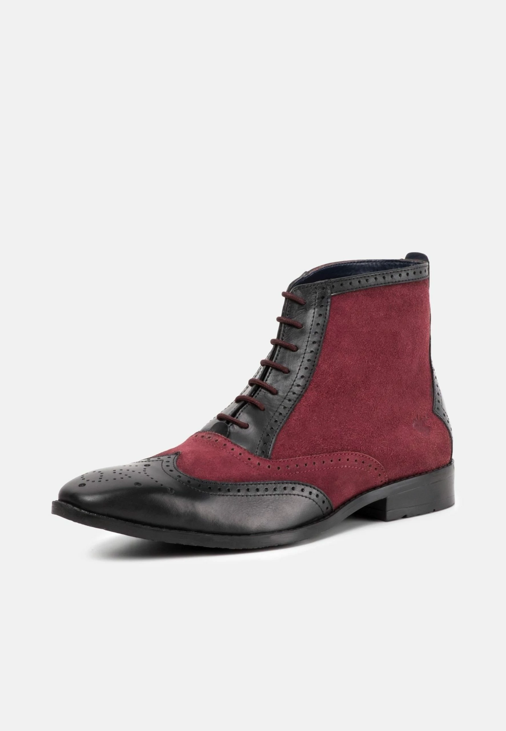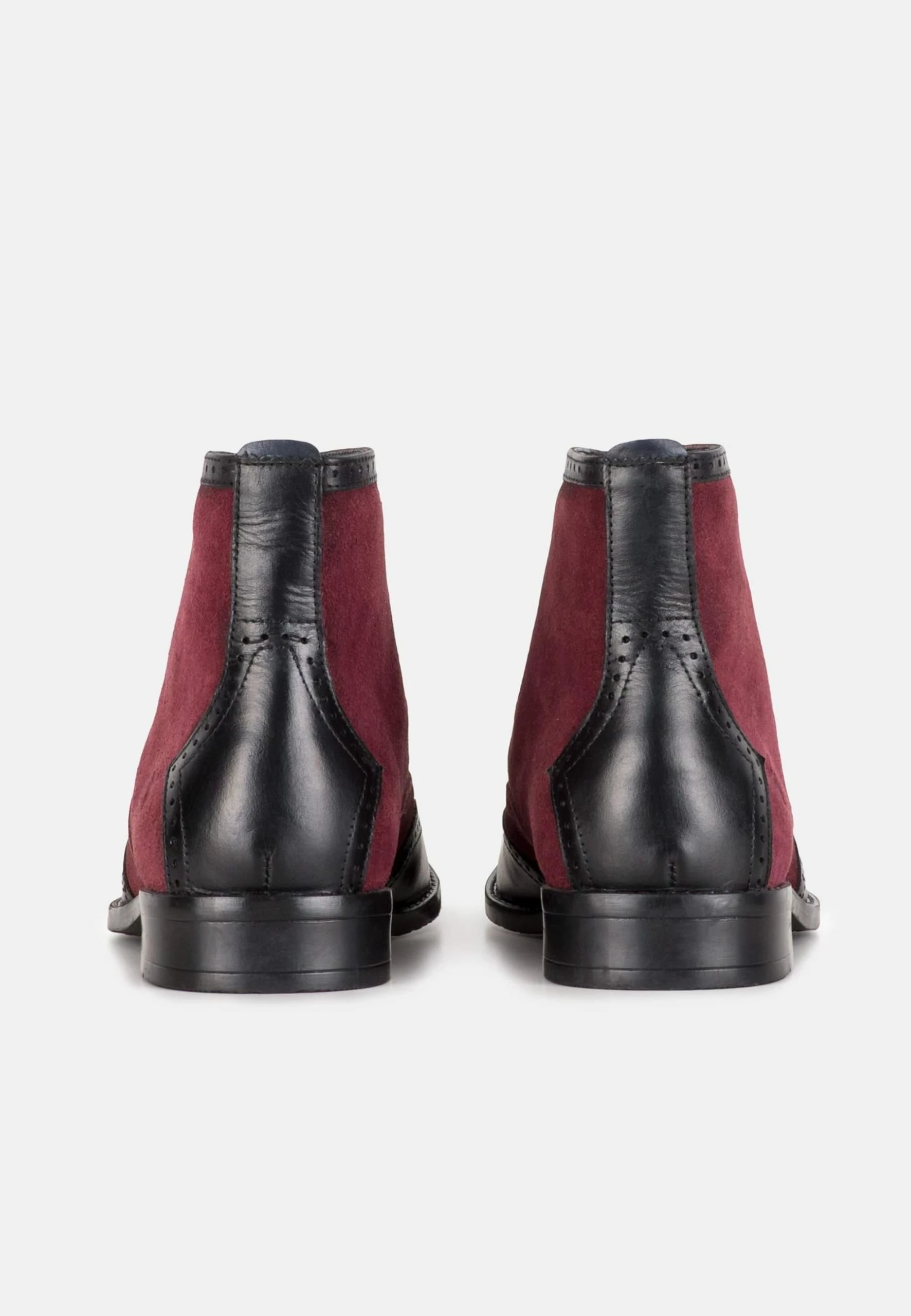 Suede and leather Gatsby style ankle boot. Samuel is a winning formula of suede base material with colour contrast overlaid leather. The leather has been expertly burnished to give a depth of tone, featuring brogue detail to the winged toe cap and lace facing. The PU and textile lining is printed with GS stag logos and the padded sock also has the logo embossed in gold. Finished off with a durable, anti-slip TPR sole branded with our trademark details. Available in black/bordo, stone/brown and navy/tan.