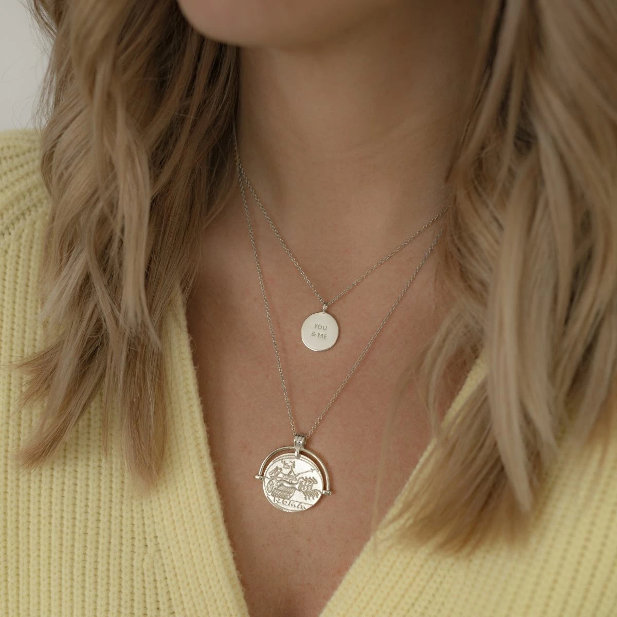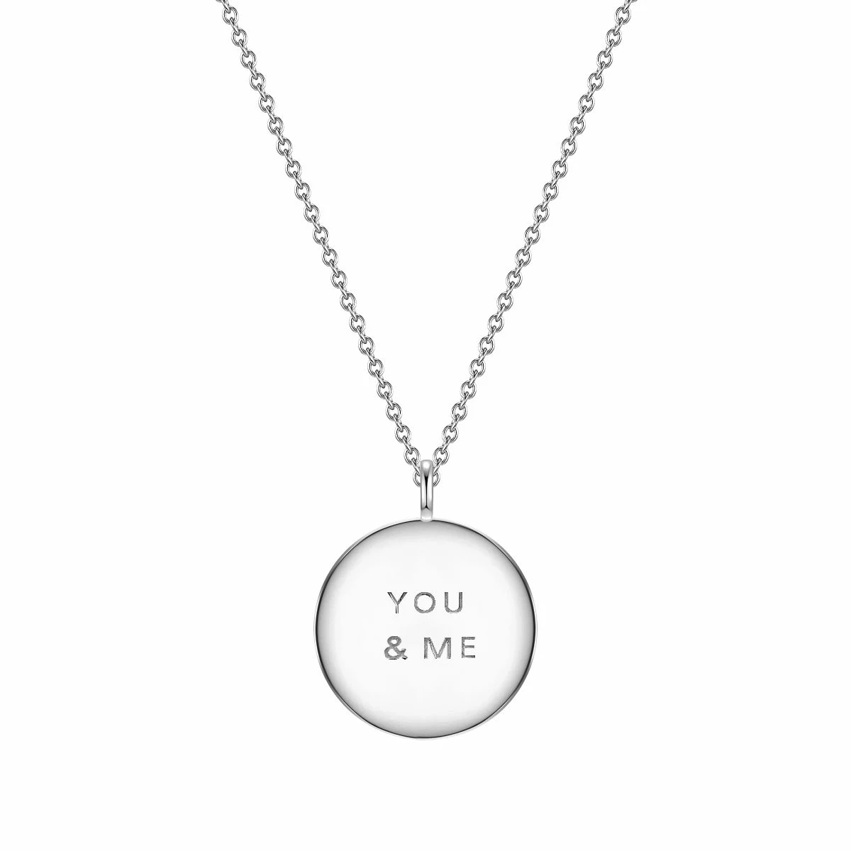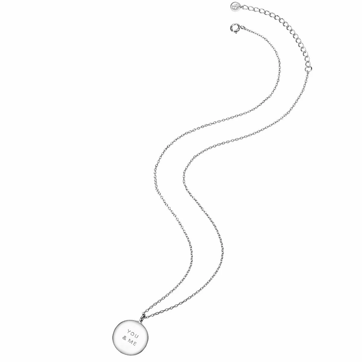You I. Common ground. Luck. How nice if you can carry this strong feeling with you every day – with this enchanting chain of the label, highlights in Munich. A romantic message implemented straightforward, the simple accessory shines the eyes of all women who love minimalist jewelry. The smooth medallion with the engraving “You & Me” adorns your neckline on a delicate anchor chain. The filigree spring ring closure and an extension chain ensure high comfort and perfect fit. Pendant and chain are made of the finest sterling silver and protected from starting with rhodium lodging.